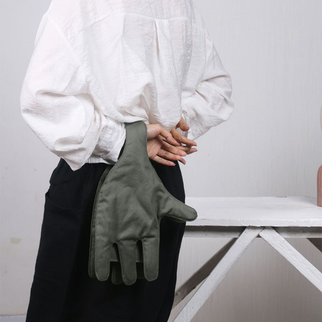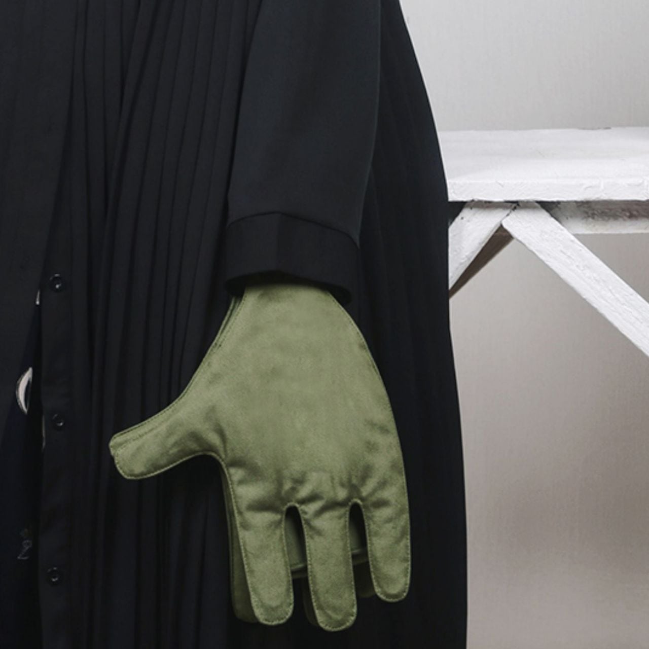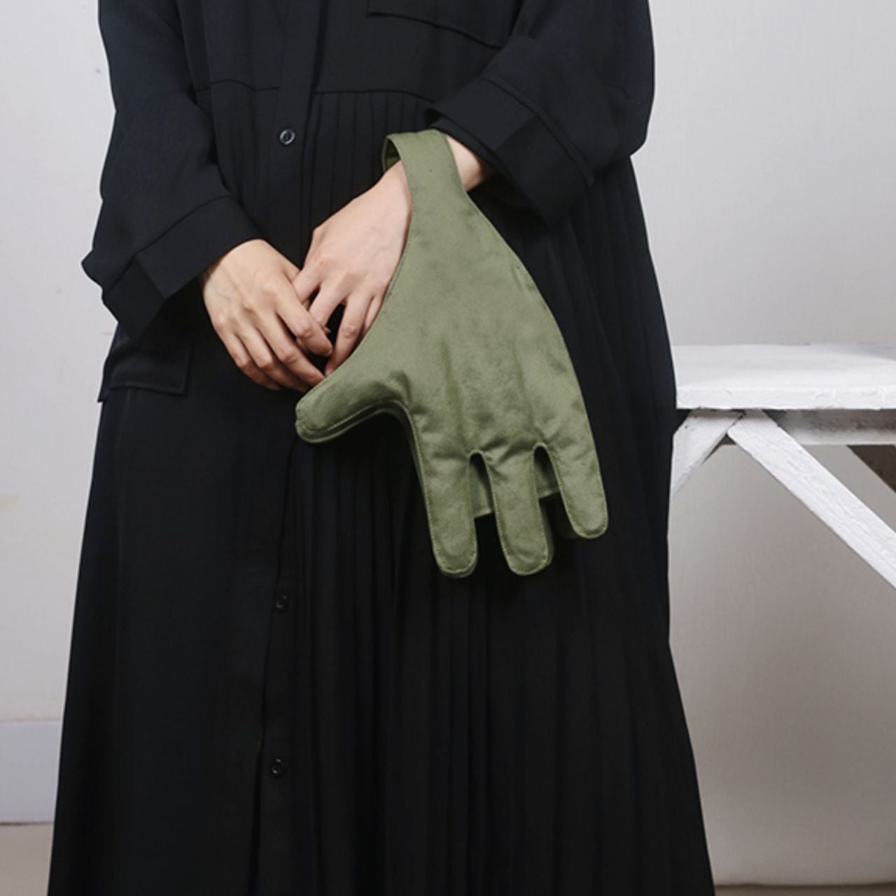 他にはない、ハンドモチーフのデザインが目を引くバッグ。