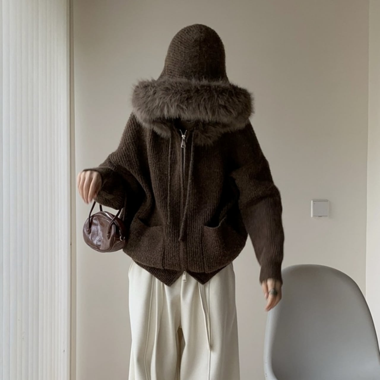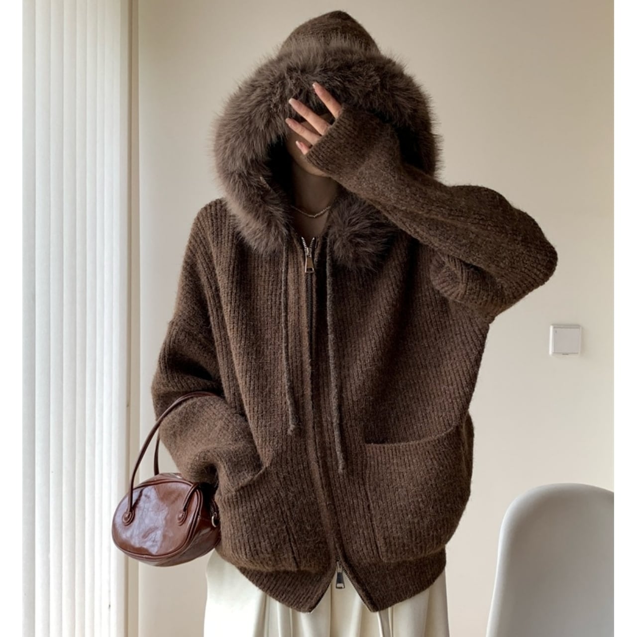 フードにあしらわれたファーが特徴的なニットジップアップカーディガン。