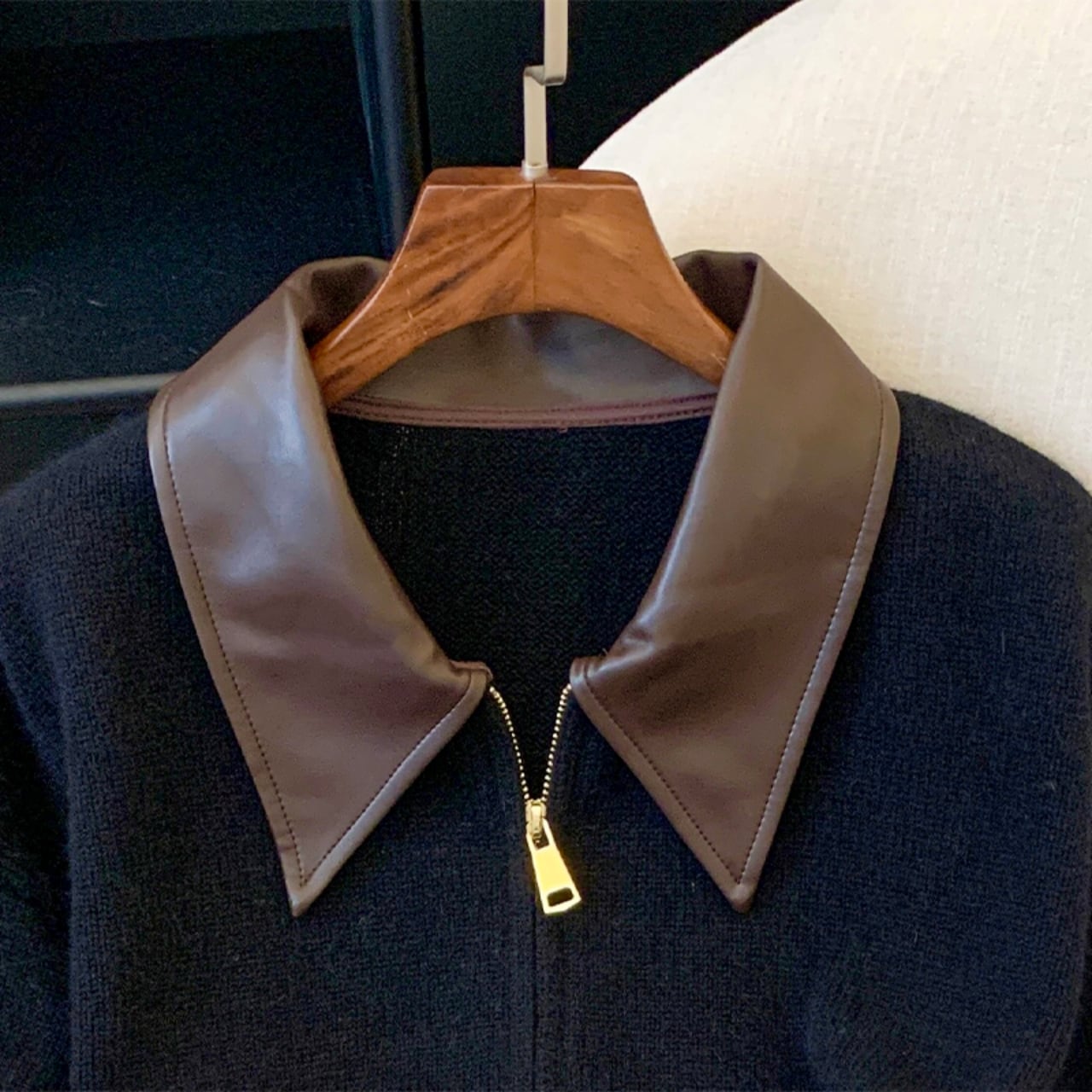 異素材の襟が目を引く、ジップアップのニットカーディガン。