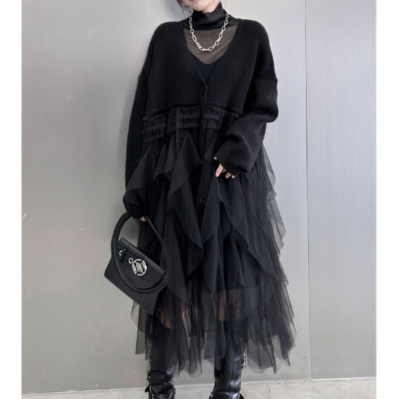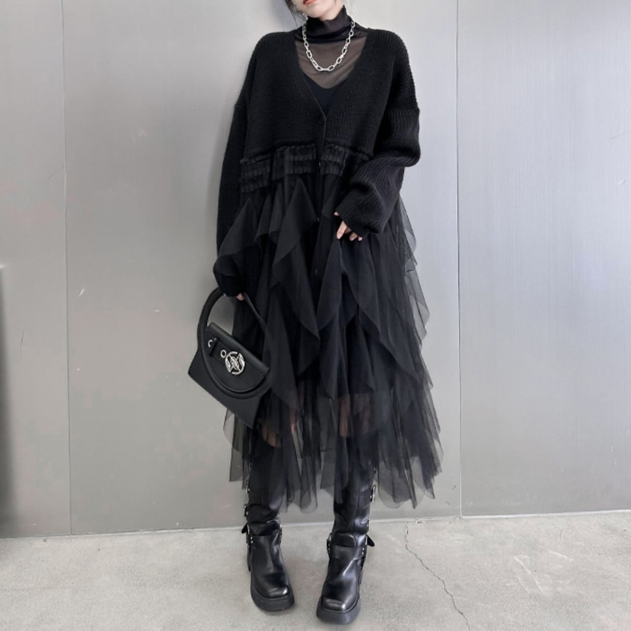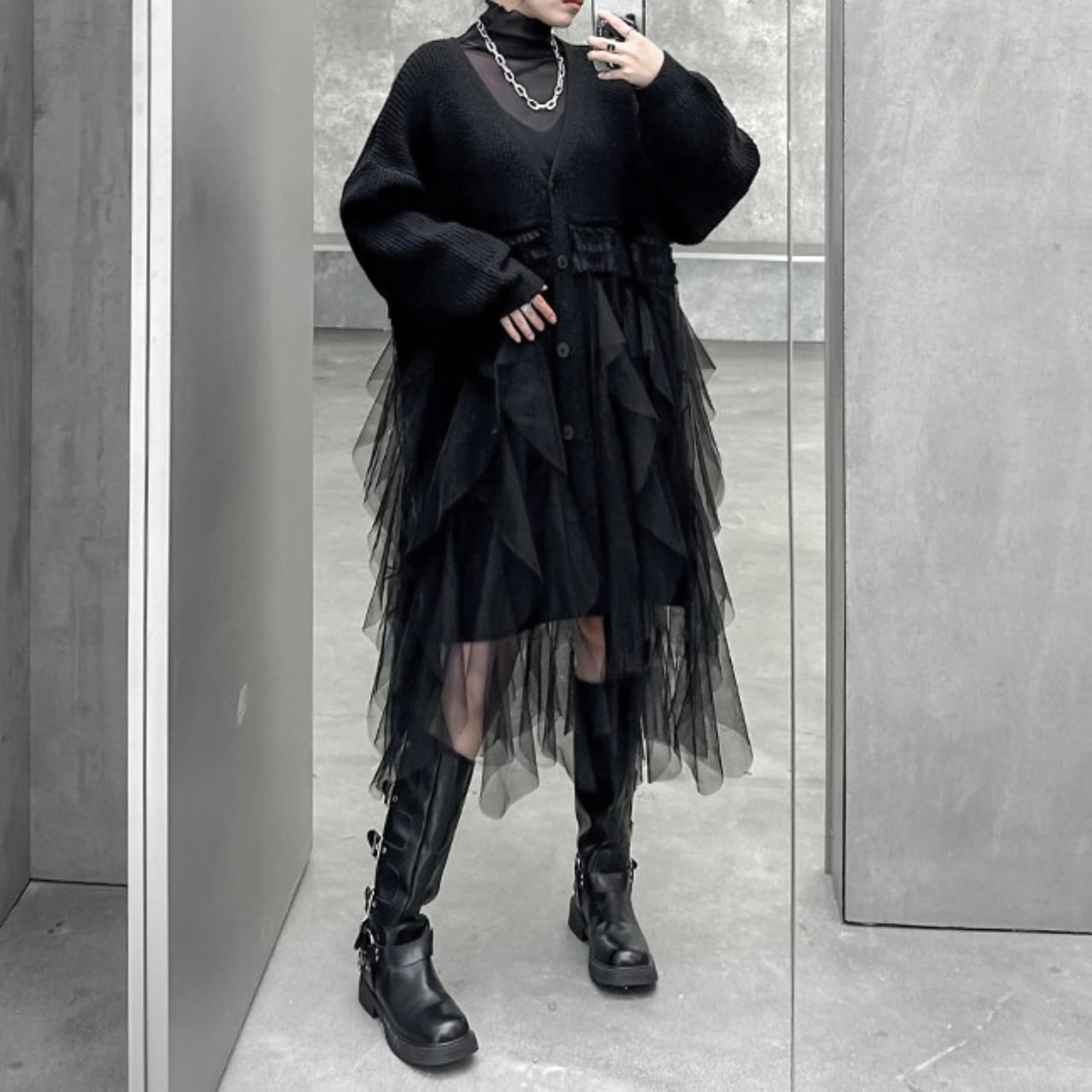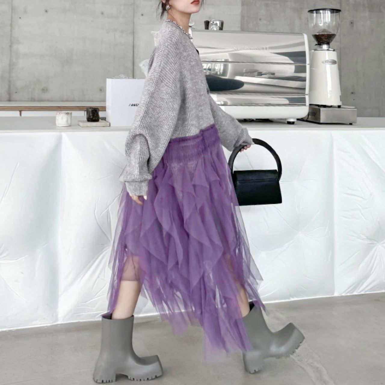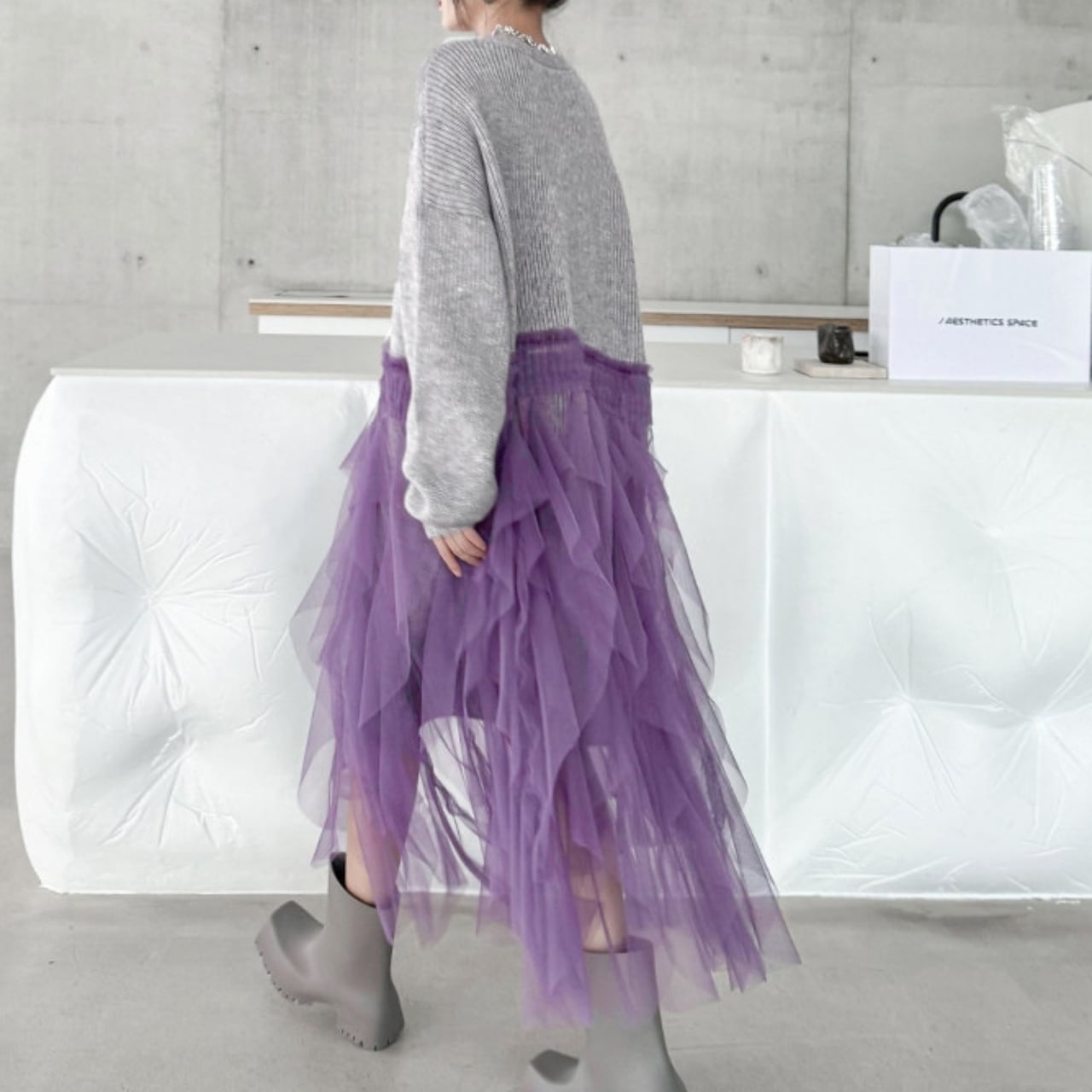 カジュアルなニット素材に、フェミニンなチュールをレイヤードし、甘辛MIXな着こなしが楽しめます。