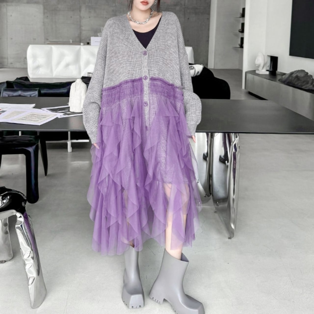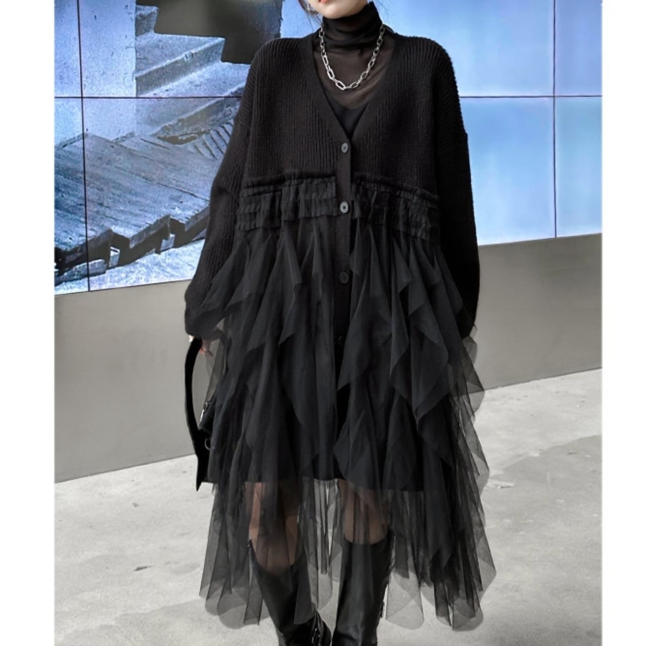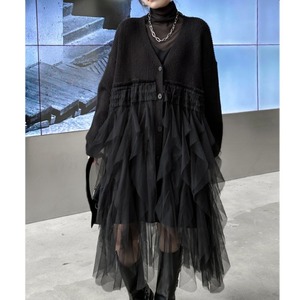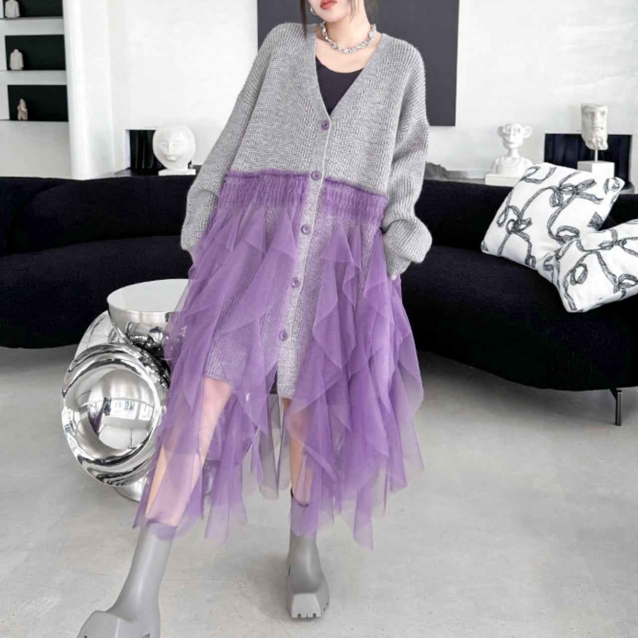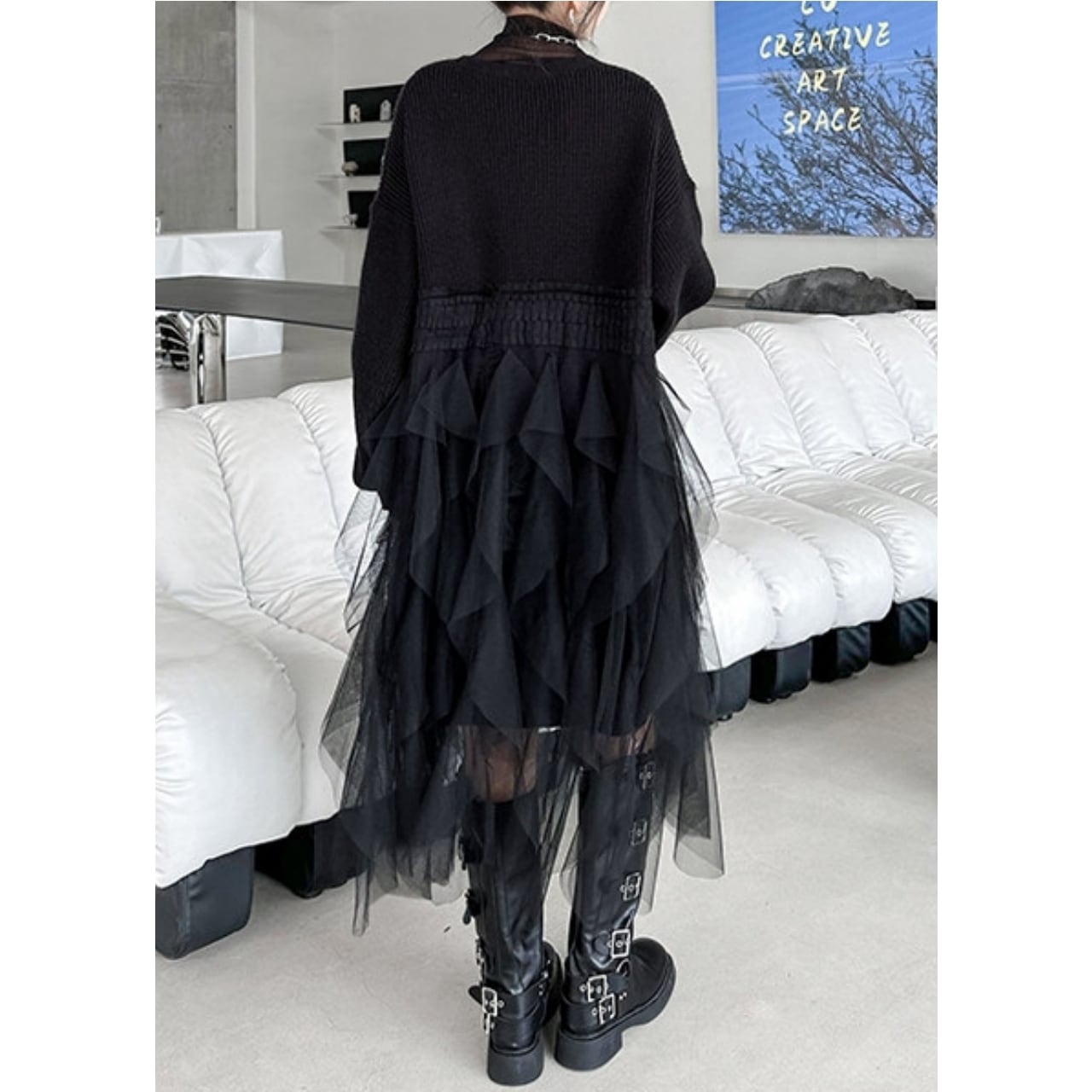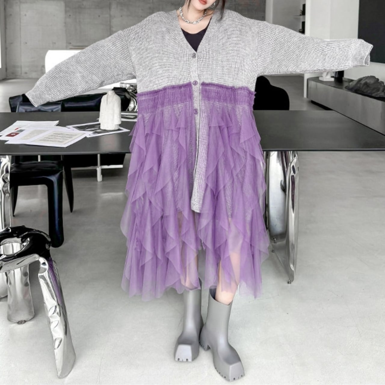 カジュアルなニット素材に、フェミニンなチュールをレイヤードし、甘辛MIXな着こなしが楽しめます。