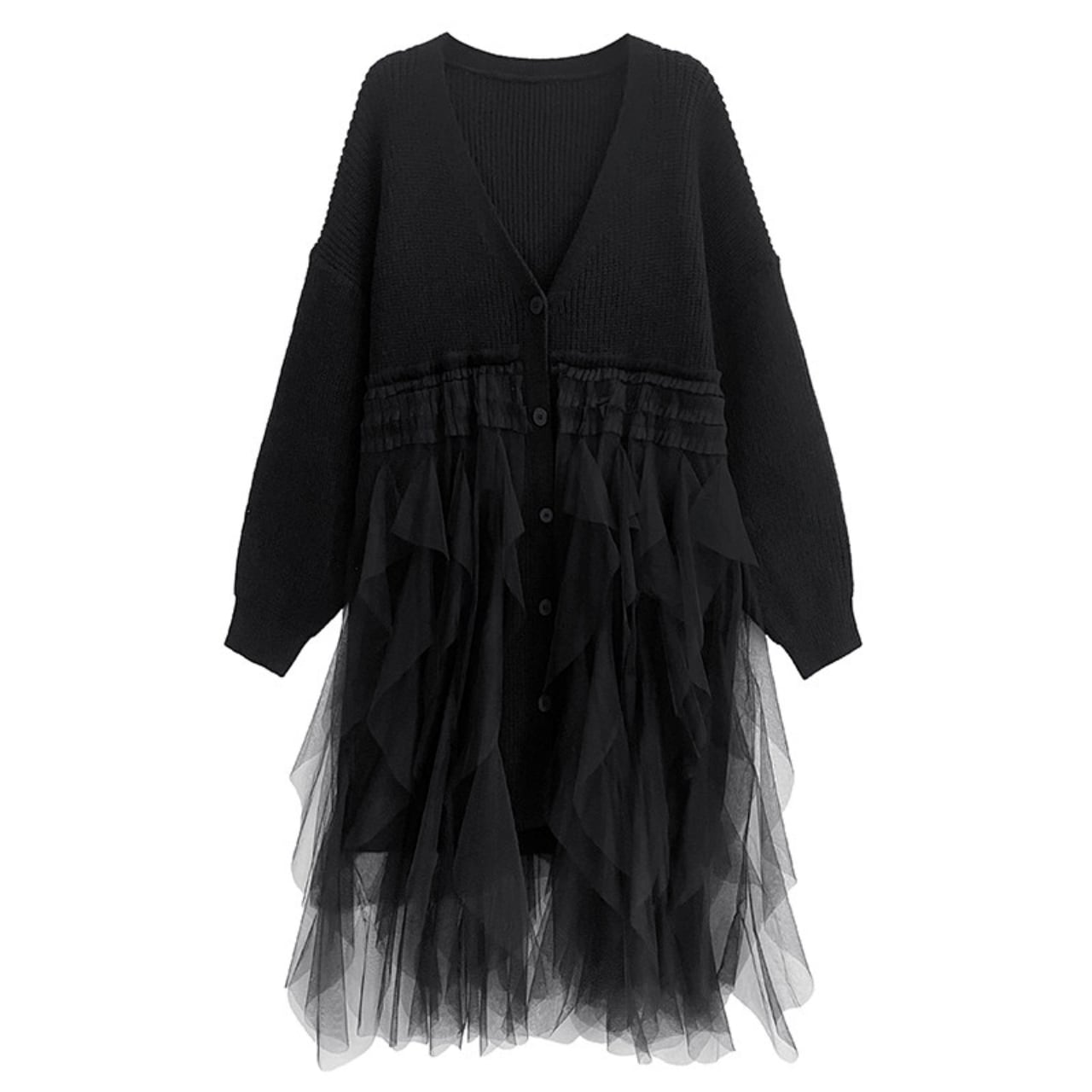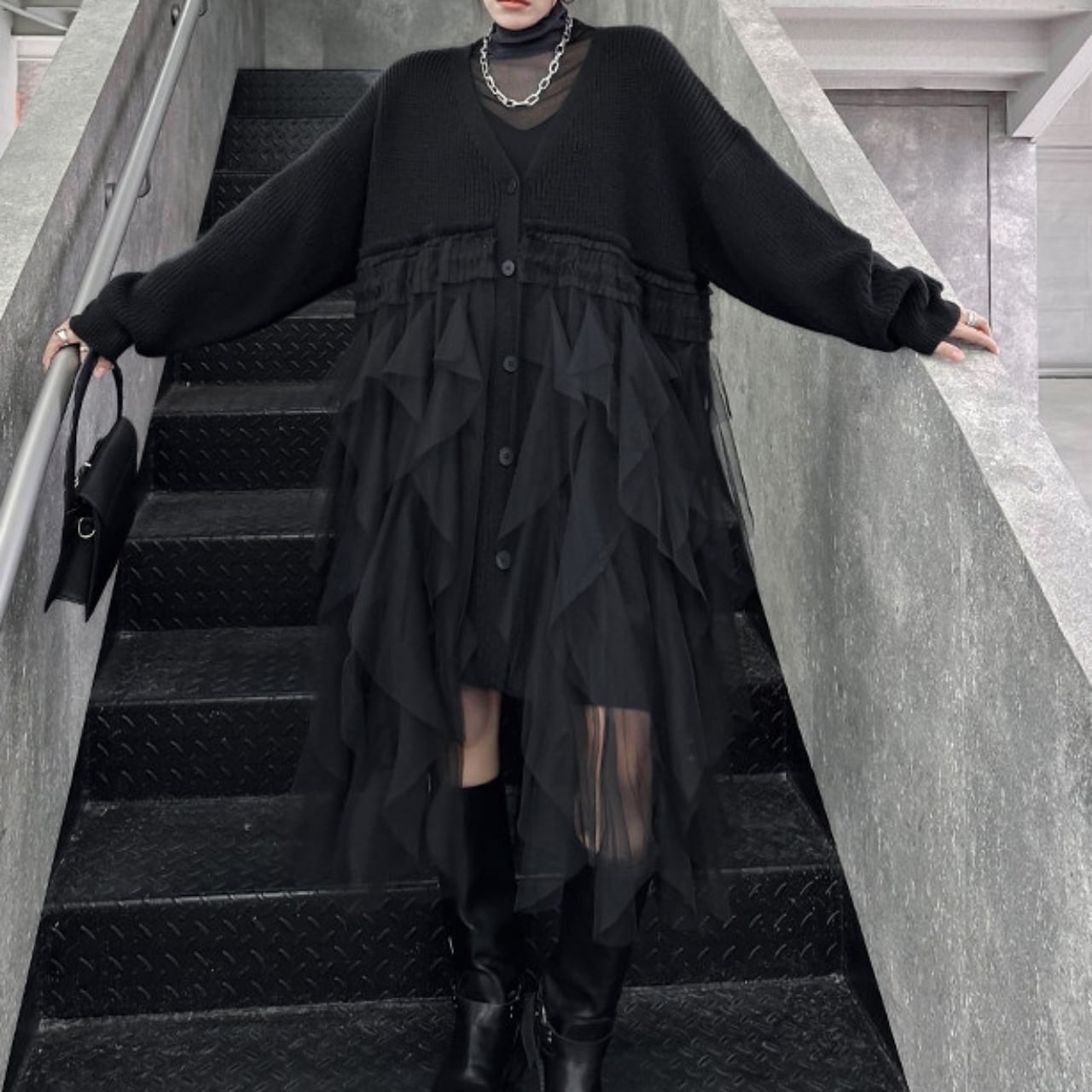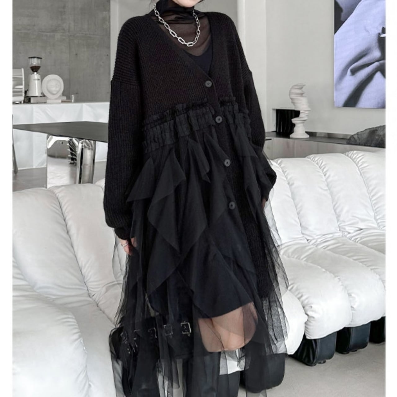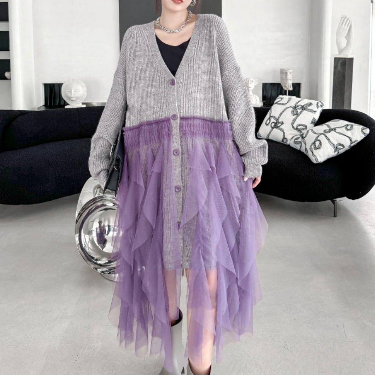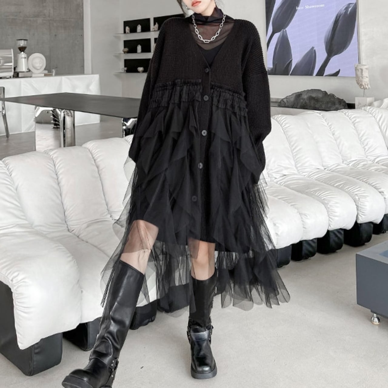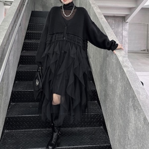 カジュアルなニット素材に、フェミニンなチュールをレイヤードし、甘辛MIXな着こなしが楽しめます。