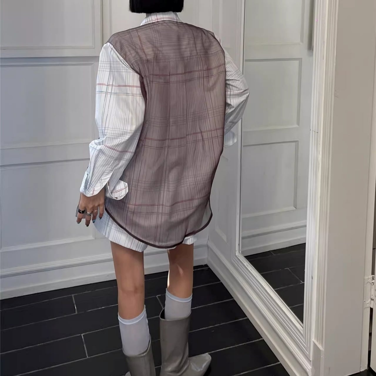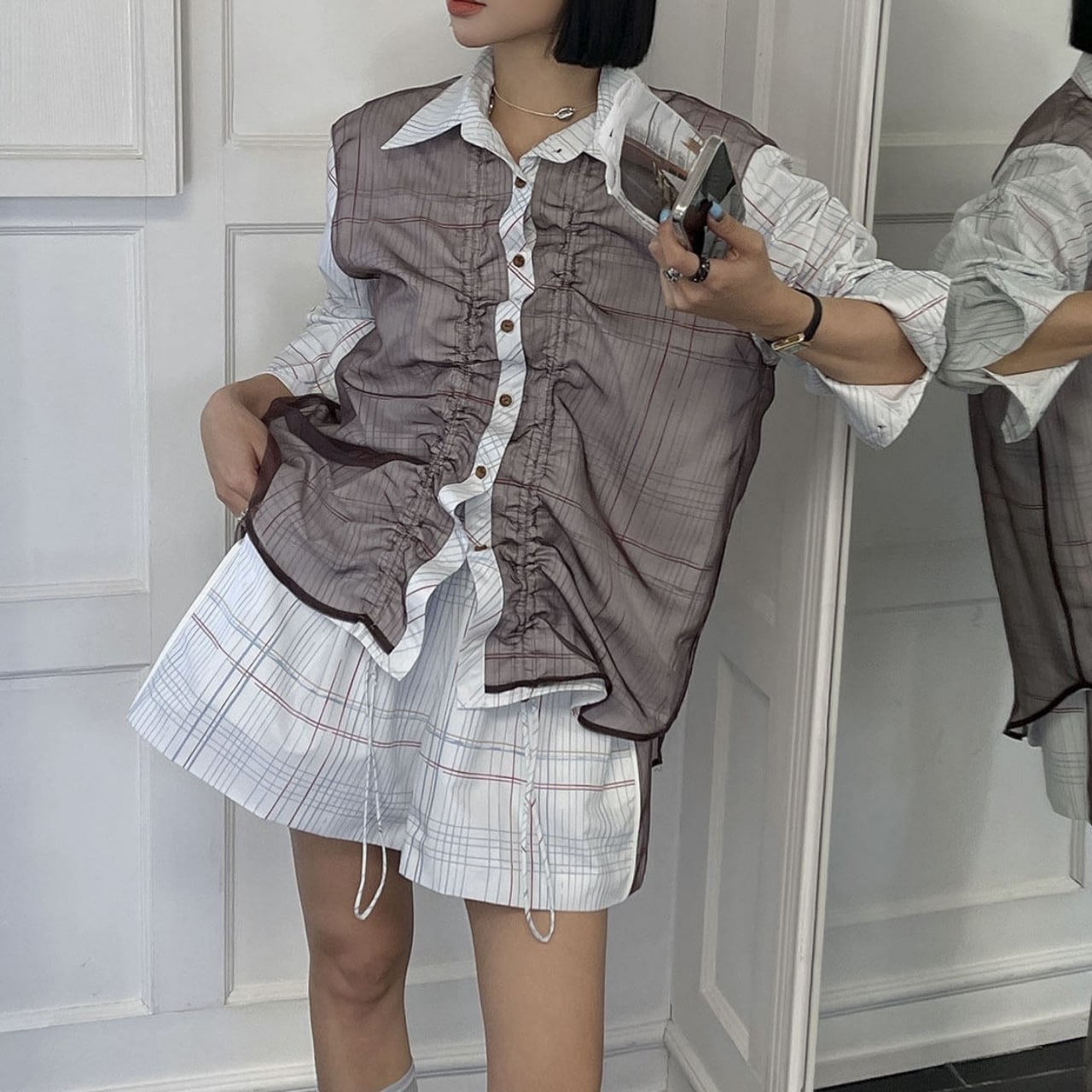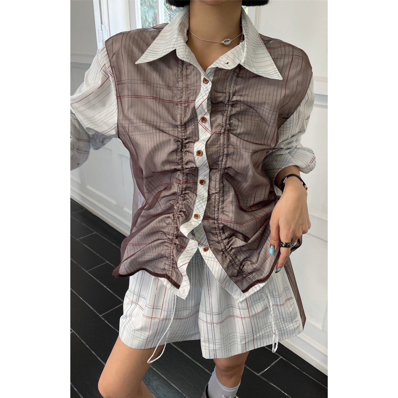 Check-Print Gathered Oversized Shirt 01160
