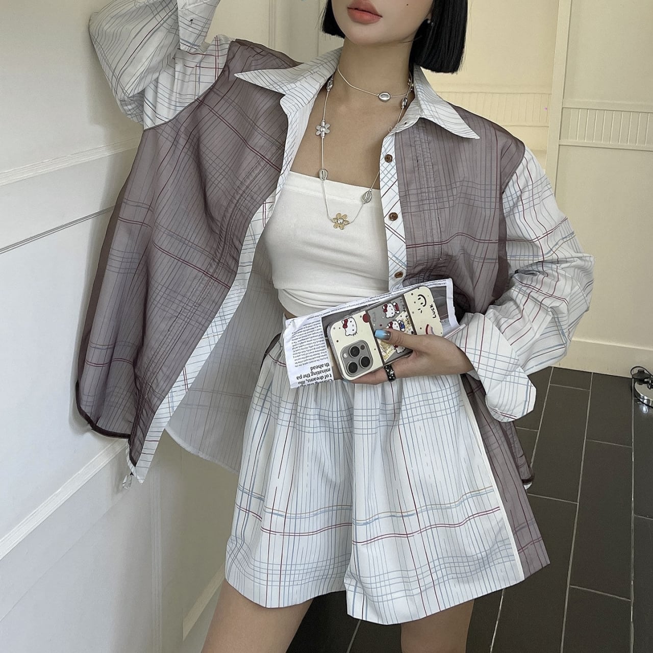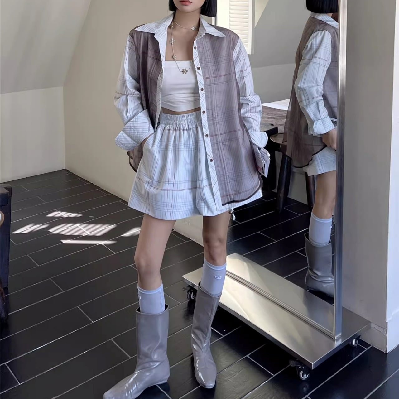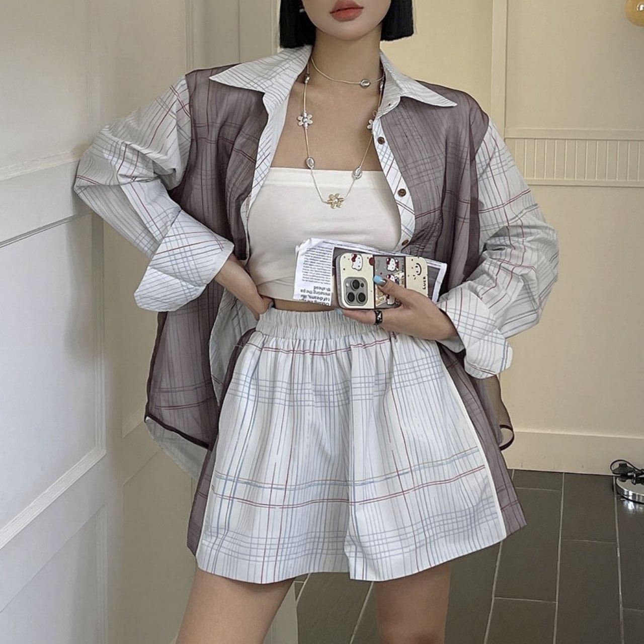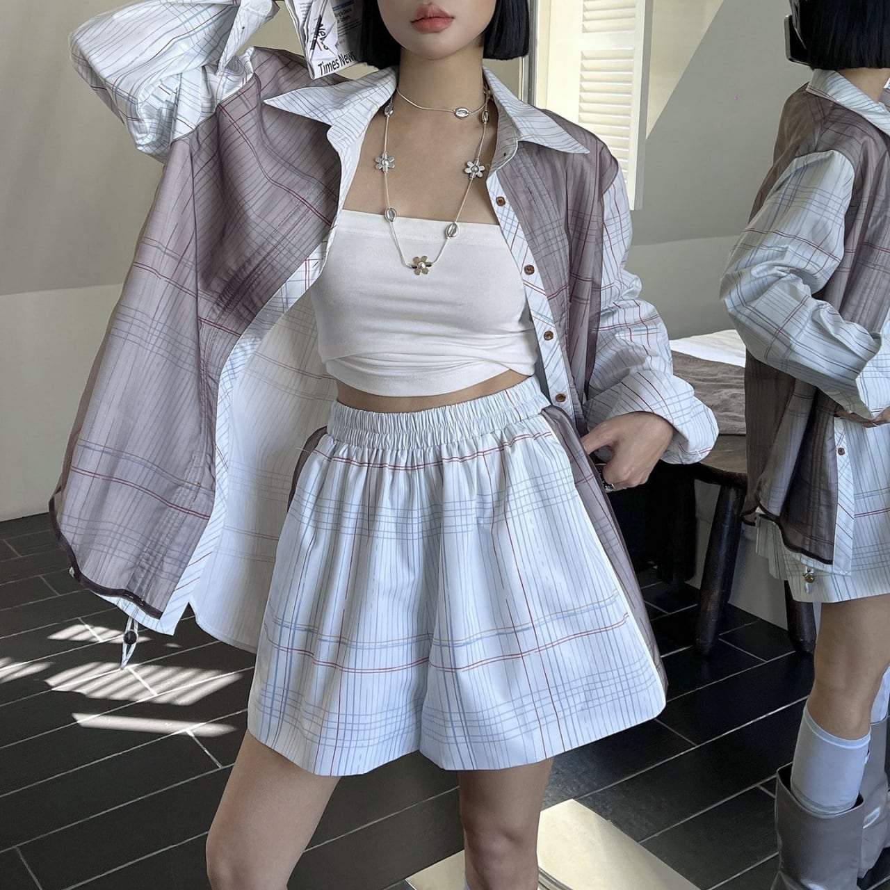 Check-Print Gathered Oversized Shirt 01160