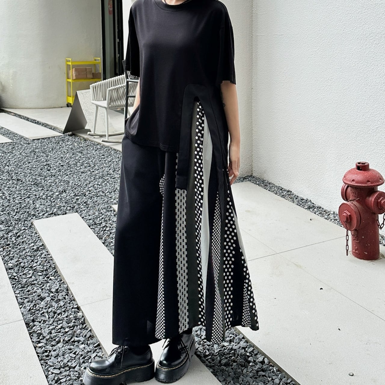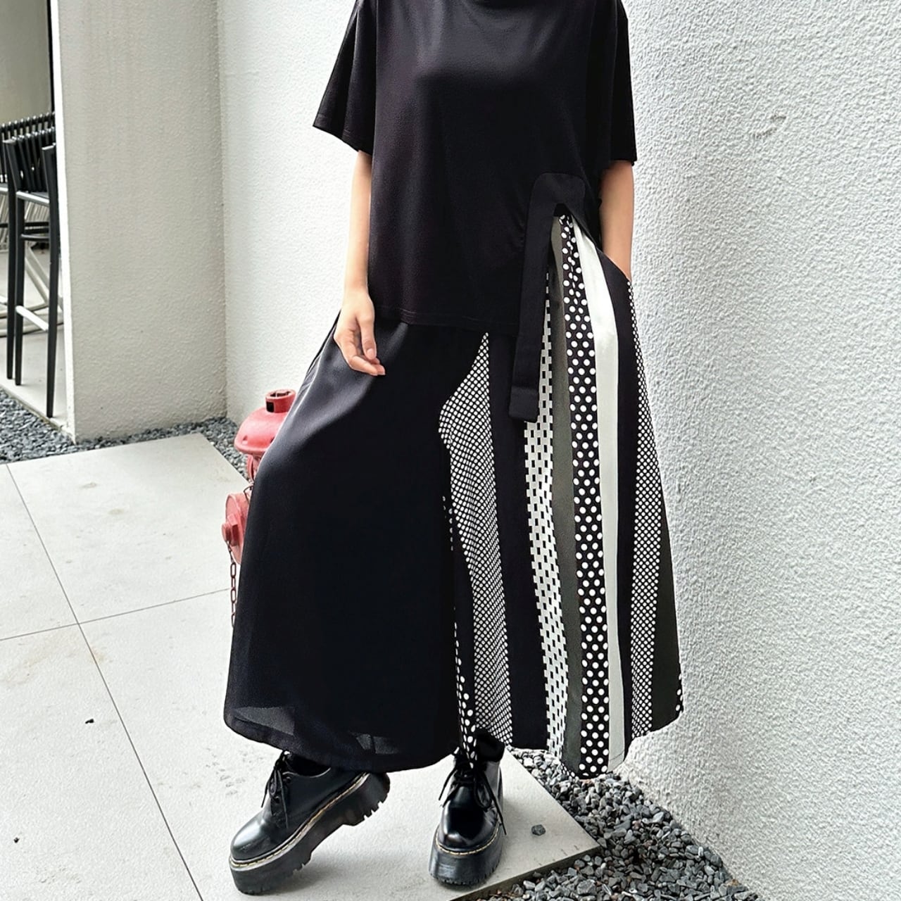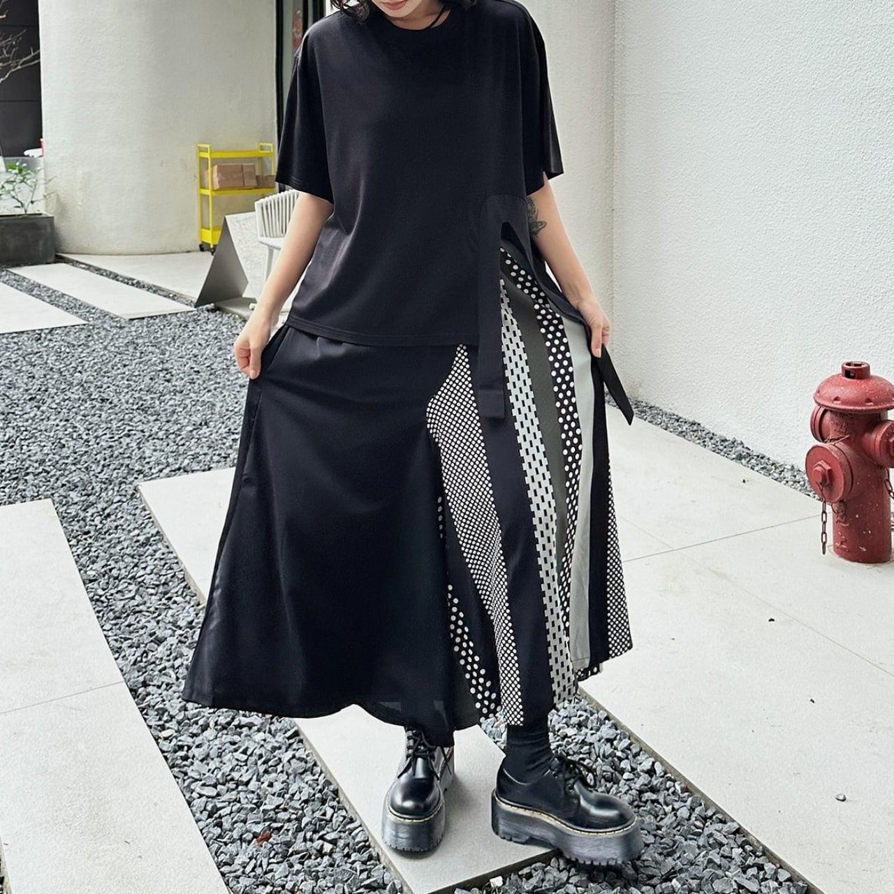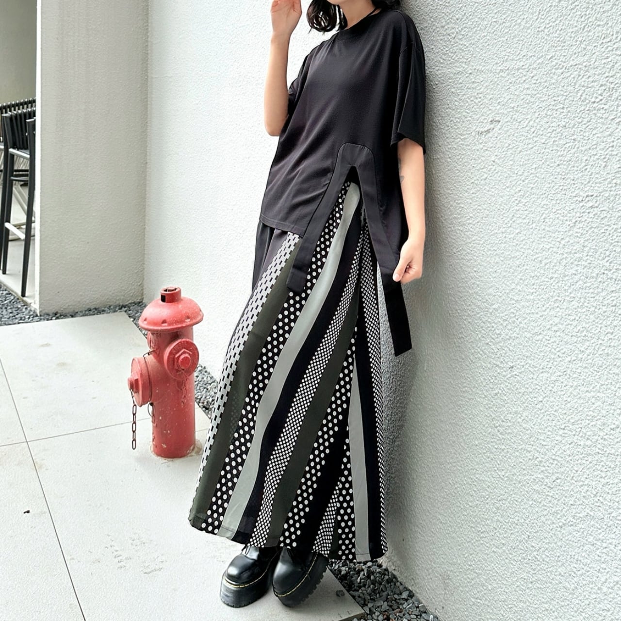 シンプルなトップスと合わせることで、スカートのデザインが際立ち、洗練された印象に。