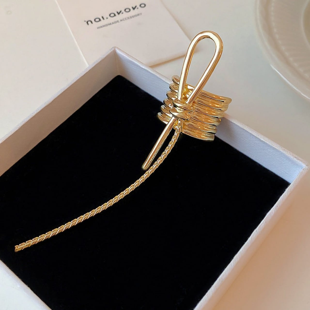 メタルの質感が、シンプルなヘアにモードなニュアンスをプラス。
