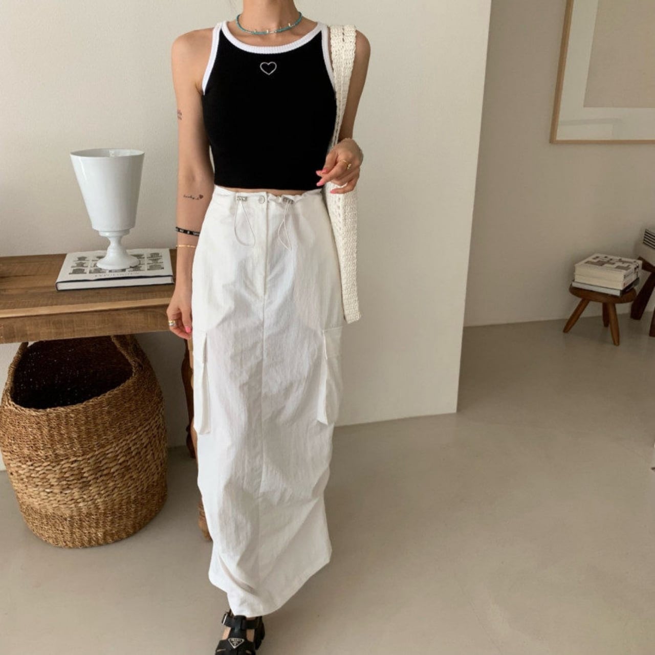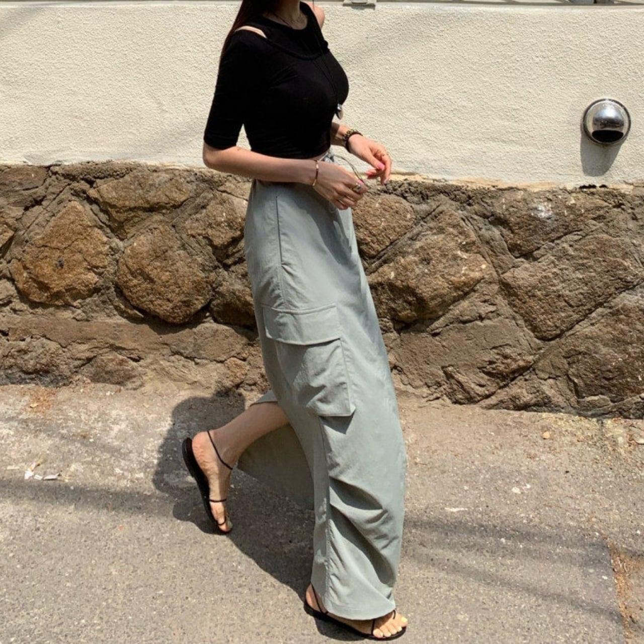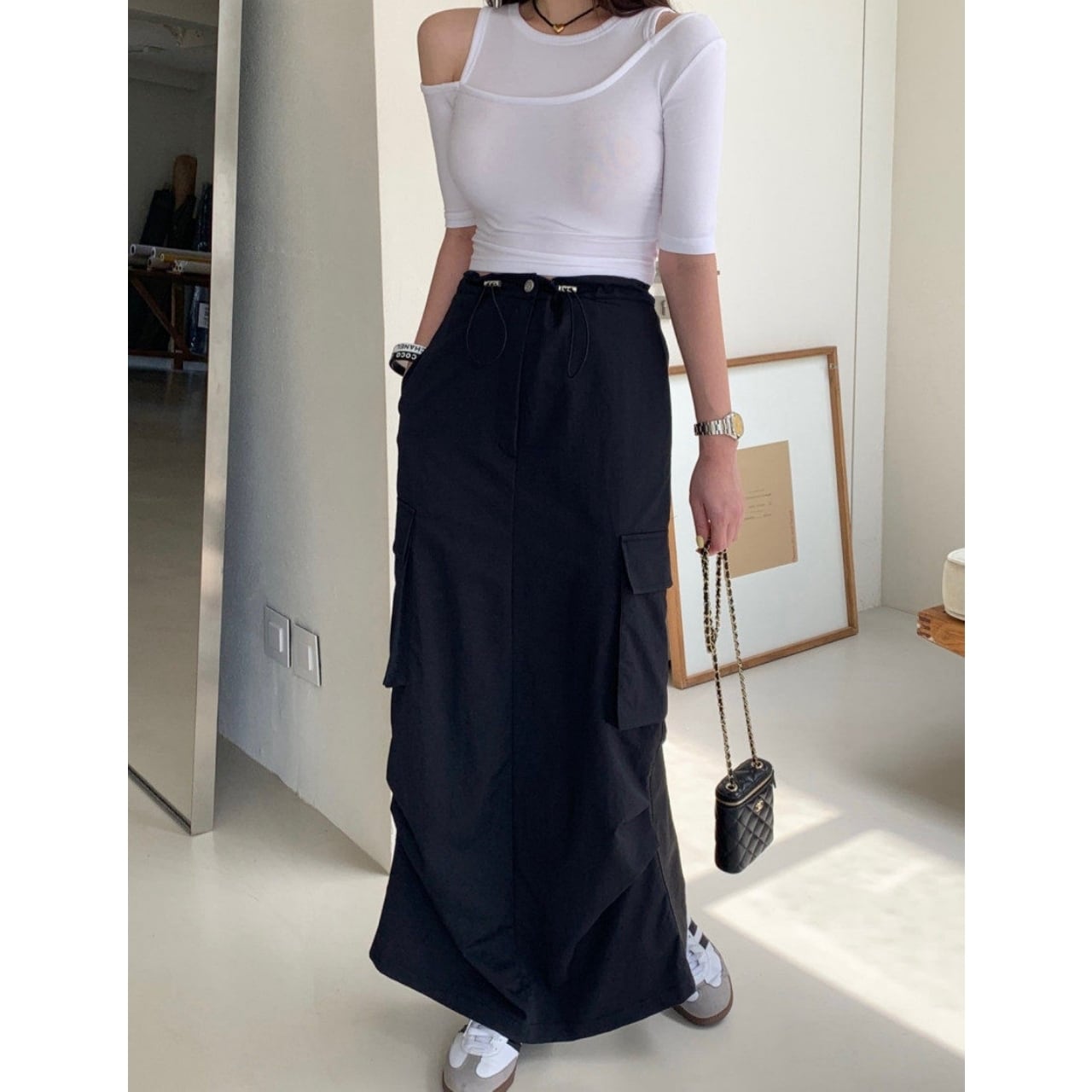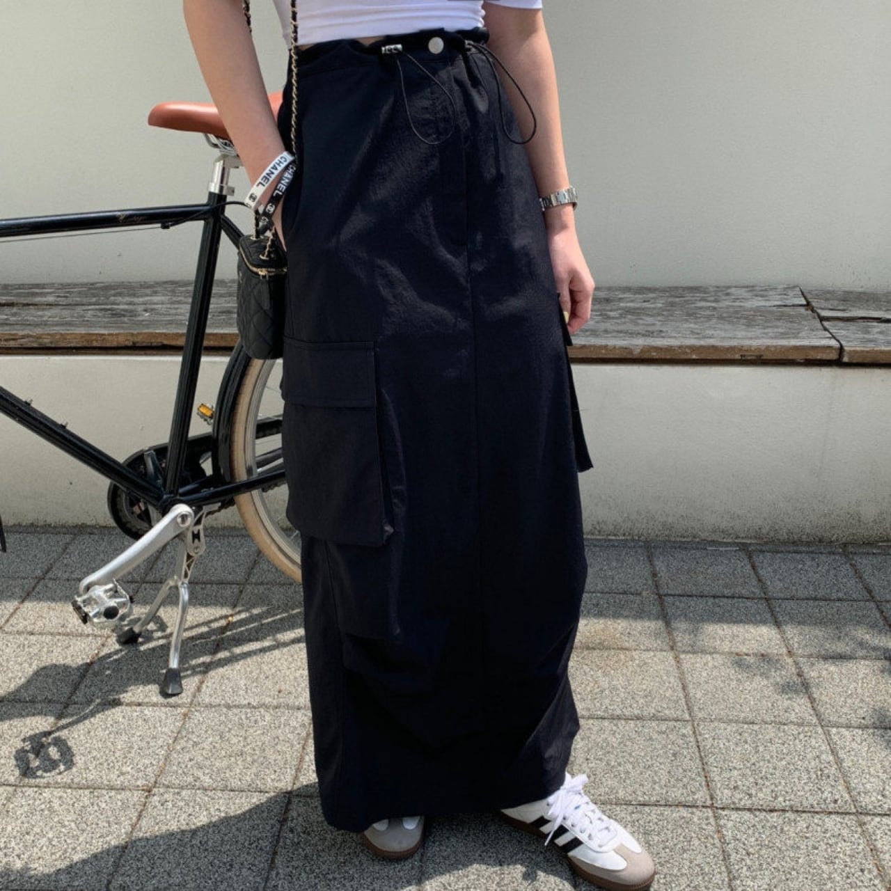 存在感のあるカーゴポケットがコーデのアクセントになり、シンプルに合わせるだけで今っぽく決まります。