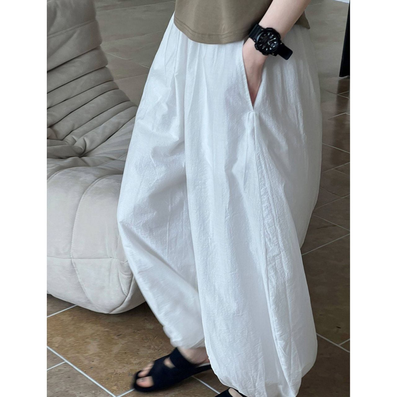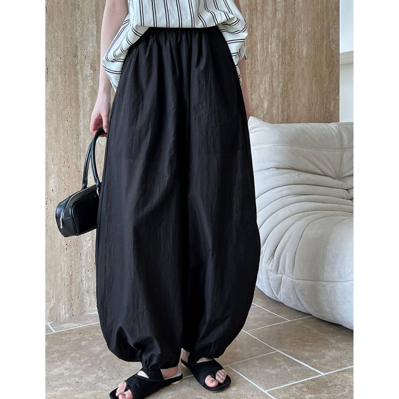足首でキュッと絞られたデザインが、タックインなしでもバランスよくスタイルアップを叶えてくれる一着です。